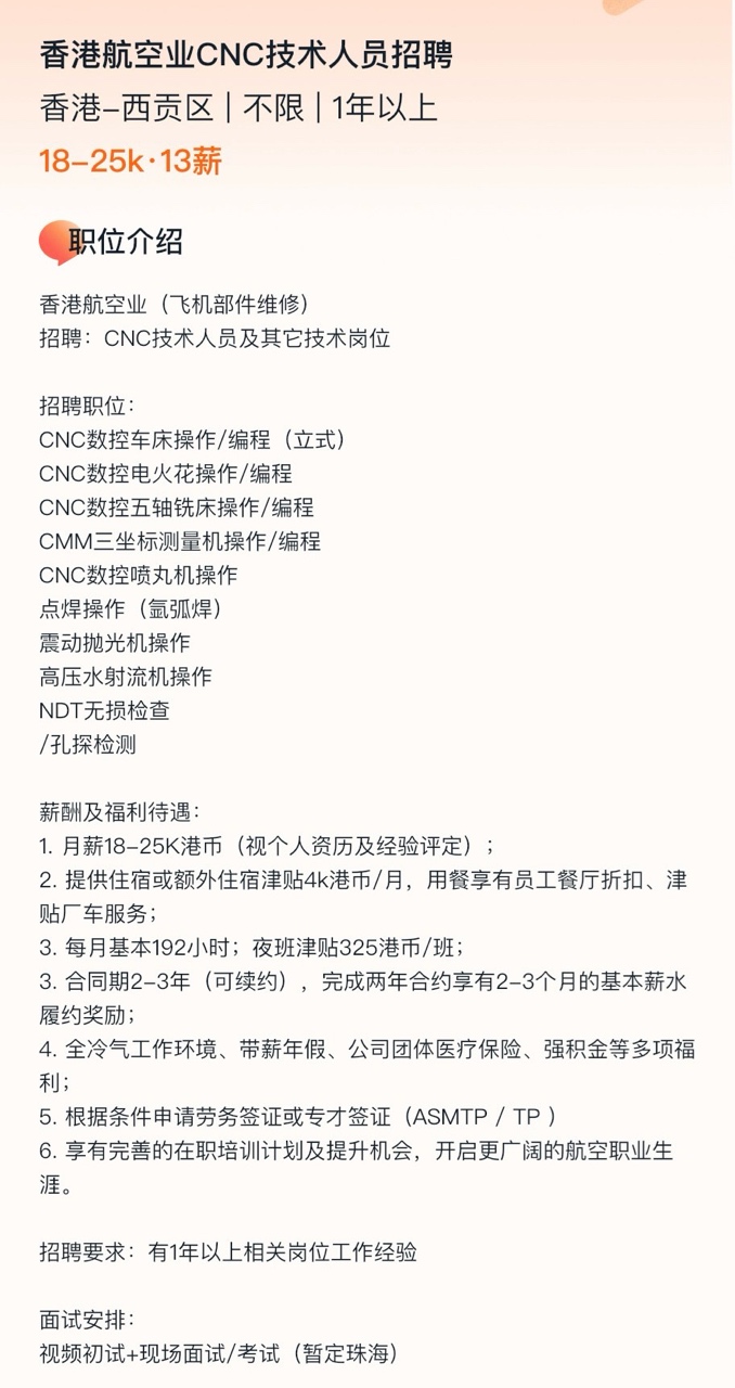 [招聘] 香港航空发动机部件维修CNC技术 |