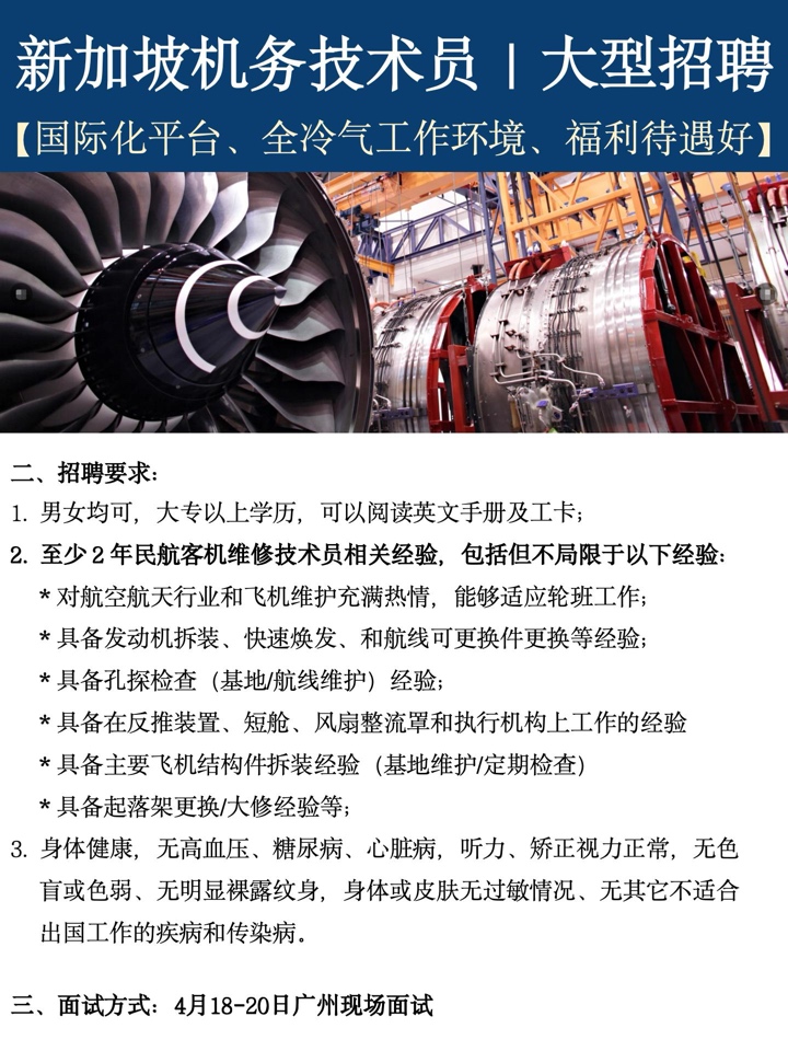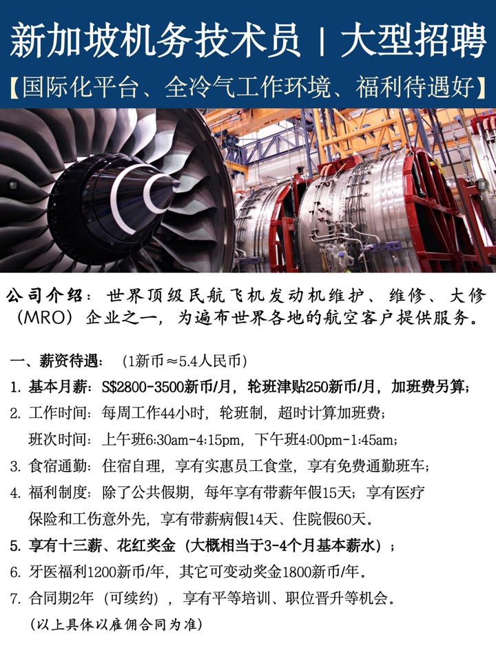[招聘] 新加坡大型飞机发动机MRO招聘 |